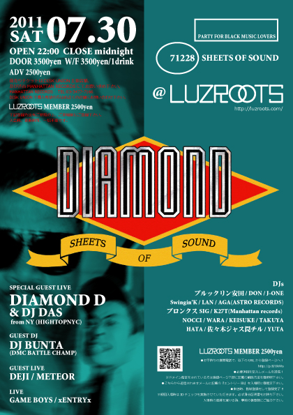 Ultimate Force、そしてDiamond & the Psychotic Neuroticsとしての活動や、D.I.T.Cのメンバーとして、世界中のHIPHOPリスナーから絶大なプロップスを誇るレジェンド、DIAMON Dが、遂に2011年夏、SHEETS OF SOUNDに出演決定。