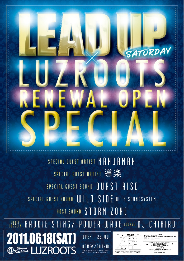 今回の"LEAD UP SATURDAY"は、meets "LUZROOTS RENEWAL OPEN SPECIAL!!!" LUZROOTS Renewalに併せて、 今回は全国各地で活躍する、Artist &Soundを招き、柏のReggaeの歴史に一石を投じる、Special Night !!! Don't miss it!!!!!!