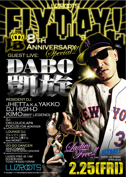 毎月第四金曜日、JHETT aka YAKKO、DJ HIGH-D、KIMOの三人をRESIDENT DJとし、最新のHIPHOPを中心に開催される、LUZROOTS FLYDAY